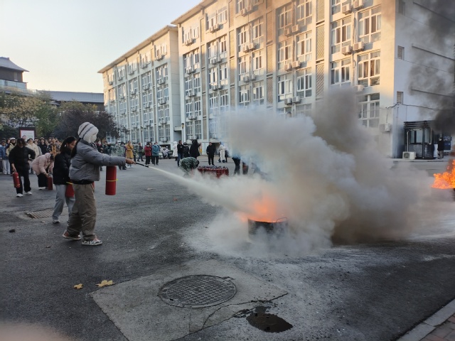 本次演练围绕“预防为主、生命至上”的主题,采取“理论讲解+实战操作”相结合的方式,全面提升参与人员的消防知识水平和实际操作能力。活动伊始,保卫部消防科负责人系统讲解了火灾危害、防火要点及初期火灾扑救等内容,通过真实案例强调了消防安全的重要性,并介绍了不同场景下的防火措施与自救方法,切实增强了师生的防火意识和应急反应能力。