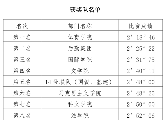 在学校党政领导的高度重视及各学院、单位、部门的积极参与下,校第十三届消防运动会于11月20日下午2:30在泉山校区敬文图书馆北侧足球场顺利举办。本届消防运动会共有30家单位组成的师生代表队参加,参赛师生共计500余人。经过激烈角逐,8支代表队获得前八名,获奖单位名单如下: